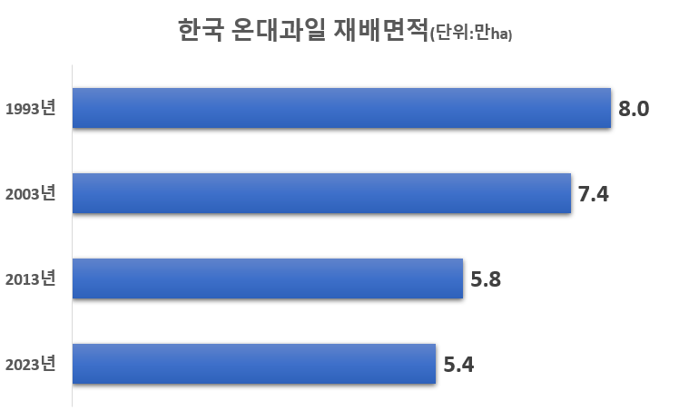 지구온난화로 인한 한반도 아열대화가 빨라지면서 사과, 배, 포도 등 주요 온대과일 재배 면적이 지속적으로 감소하고 있습니다. 이에 따른 공급 감소가 푸드플레이션(식품 물가 상승)을 야기하며, 소비자의 소비 패턴 변화까지 이어지고 있습니다. 이러한 기후변화 문제에 대한 정부 차원의 중장기적 대책 마련이 시급한 실정입니다.