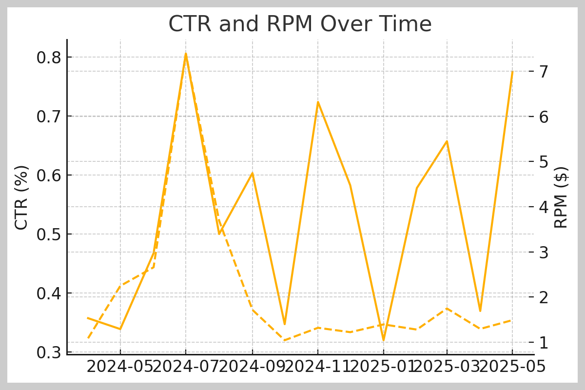 - RPM 최고 7.3 $ → 평균 2 $ 대. 광고 위치·콘텐츠 타입 개선 필요.