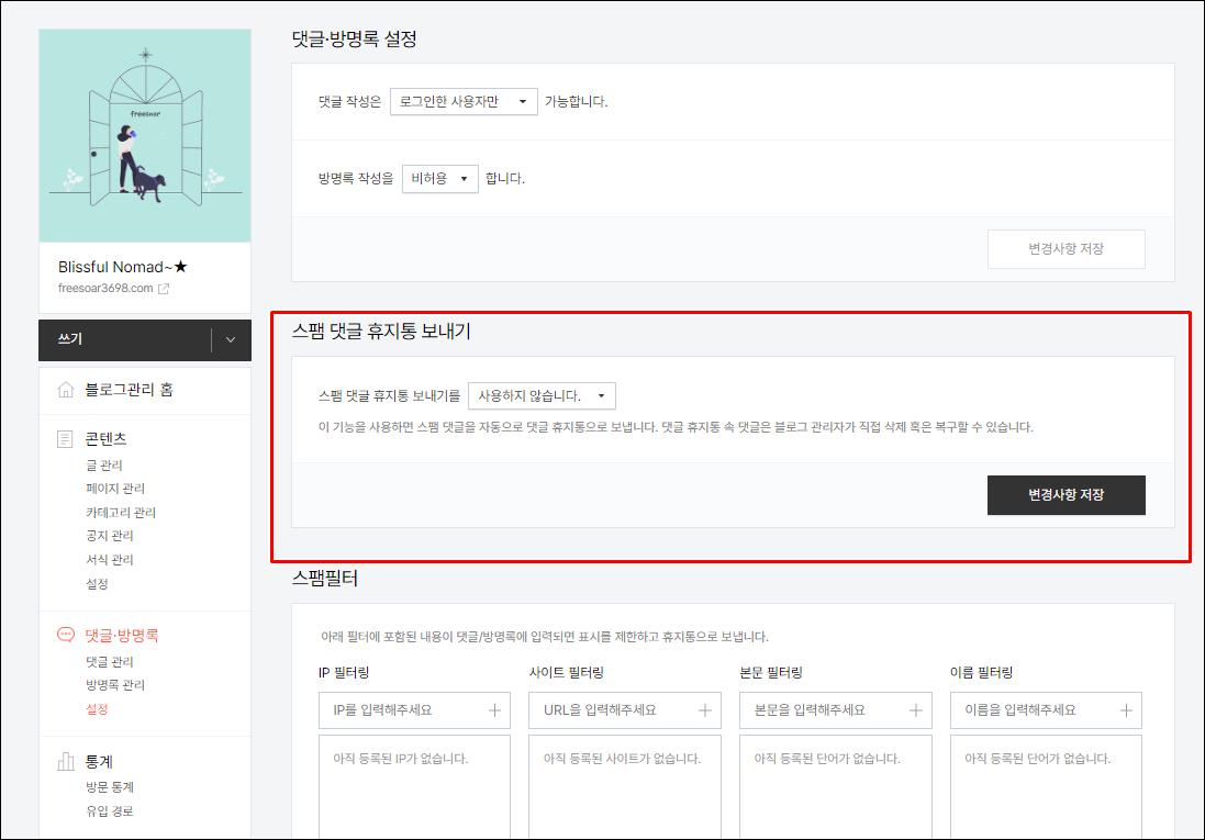 '스팸 댓글 휴지통 보내기' 기능 설정 방법 및 휴지통 관리와 활용