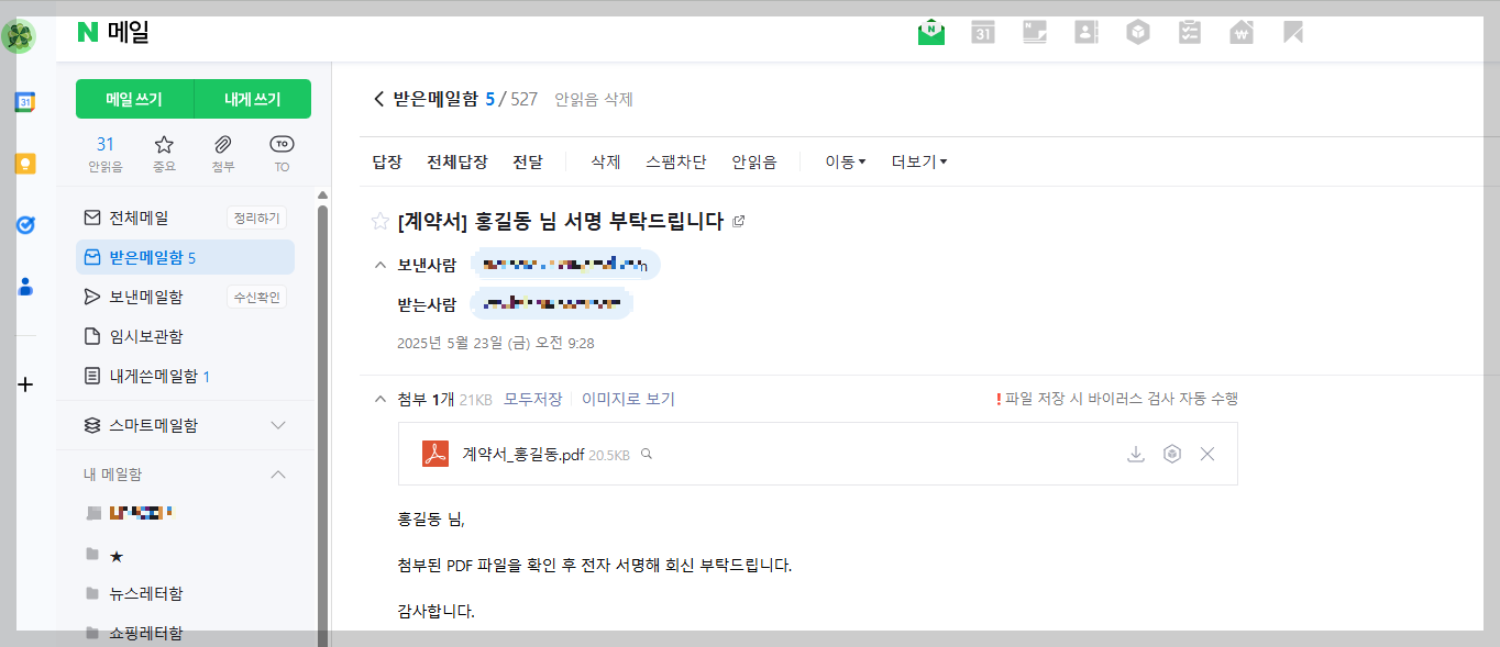 '본문: 첨부 PDF에 전자 서명해 회신 부탁드립니다.',